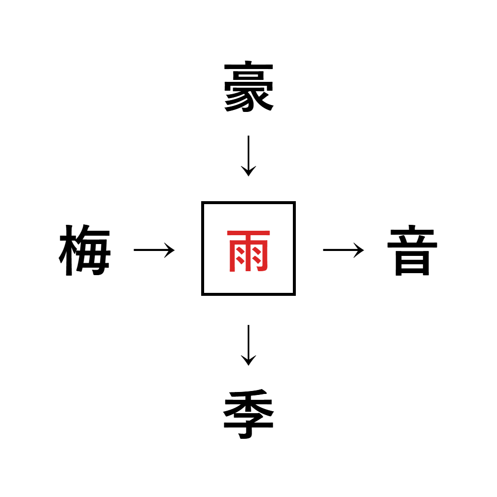 豪雨・雨音・雨季・梅雨のように、共通する漢字は「雨」です。